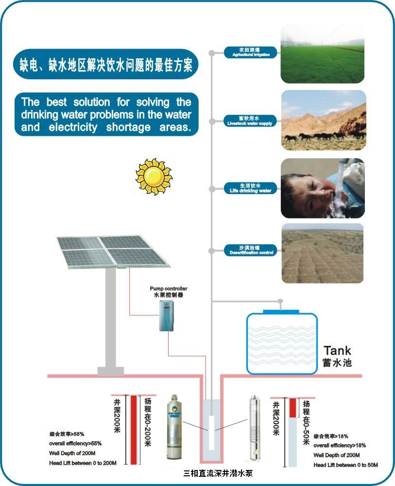 直流太陽能水(shuǐ)泵主要用於村莊或戶用供水、牲口飲水及農場灌溉、野外宿營供水、邊遠無電地區供水、降低地(dì)下水位、增(zēng)壓(yā)及各種(zhǒng)工業用途;可以在小直徑4英寸的管道井或開口中(zhōng)使用, 也可以在各種湖(hú)泊、水塘和河渠等水源中取水。