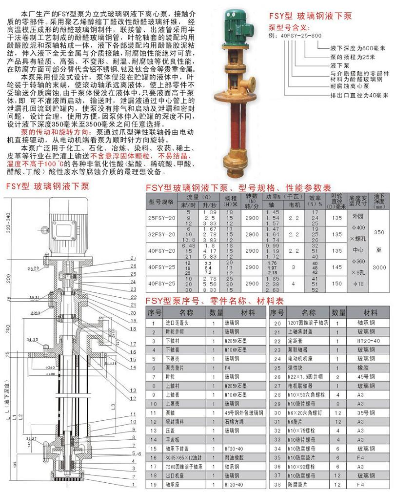 玻璃鋼(酚醛樹脂)對非氧化性(xìng)酸(鹽酸、稀硫酸、磷酸等)、鹽類溶液、水都有良好的耐蝕性,不耐堿和(hé)氧化性酸(硝酸、鉻酸等)的腐蝕(shí),高耐溫度約為120~150℃,低溫度為-20℃。本單位應用(yòng)此材料生(shēng)產的SY型立式玻璃(lí)鋼液下泵、WSY型泵為立(lì)式玻璃鋼液下(xià)旋渦泵、FSY型泵為立式玻璃鋼液(yè)下離(lí)心泵。該泵因伸入貯罐,貯槽的深度長短(duǎn)不同,設計液下深度500mm--3000mm之間任意選擇。隻要液(yè)體高於泵體,即可不灌液而起動送液(yè),平蓋板下設有泄(xiè)漏孔,液體不會向貯罐外泄漏。
