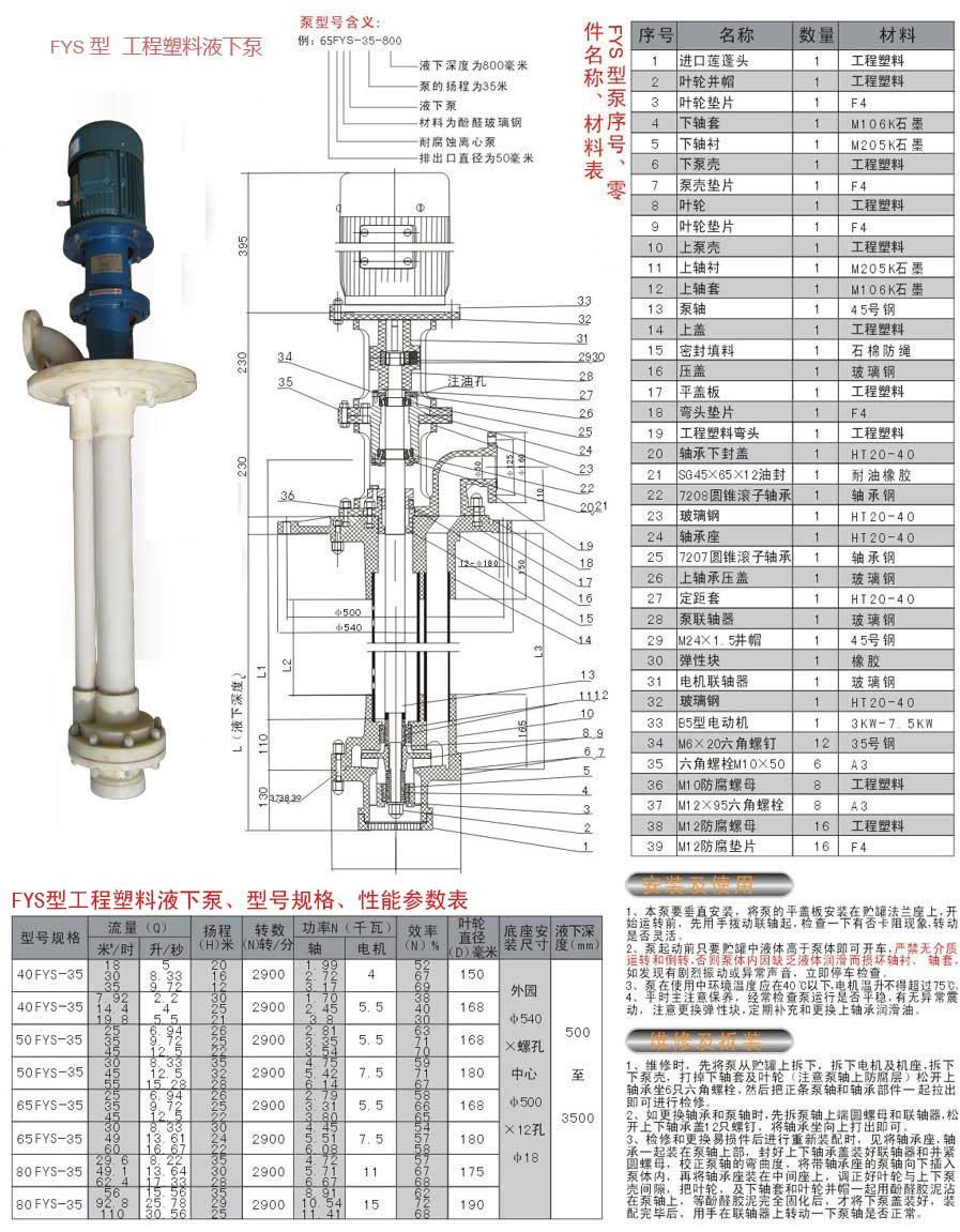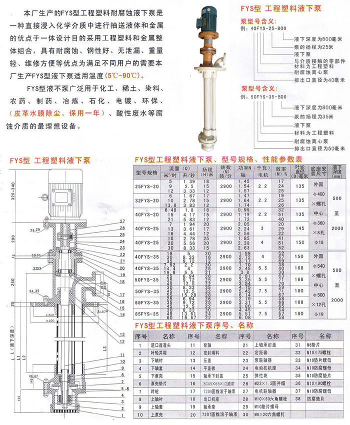 FYS係列工程塑料(liào)液下(xià)泵是我廠總結國內(nèi)外液下泵(bèng)的優缺(quē)點(diǎn),整(zhěng)合優異的耐腐材料(liào)資源創新優化設計改(gǎi)進而來,依靠此原來更合理的(de)結構和材質組台,性能已超越其它(tā)同類型產品。泵過流部件均為超高分子量聚乙烯(UHMWPE)整體模壓成型。該材質特出的優(yōu)點是:優異的耐磨性、耐衝擊性、抗蠕變性,同時還具有極好的耐腐蝕性,該泵適宜輸送處於低位槽中的,-20℃~90℃範圍內的酸性、堿性料漿或清液。輕鬆(sōng)解決了用臥式泵輸送低位槽中(zhōng)的液體時,所存在的工作不可靠,以及跑冒滴(dī)漏問題(tí),明顯改善了現場環(huán)境(jìng)衛生。該係列泵自批量生產以來(lái),經過各種崗位的長期使用,其耐磨性、耐腐性、耐溫性、機械可靠性以及(jí)維護成本(běn)的經濟性都得到了廣大用戶的(de)認(rèn)可。用途