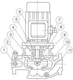 1.泵為立式結構,進出口(kǒu)口徑相同,且位(wèi)於同一中心線上,可象閥門一樣安(ān)裝於管路之中,外形緊湊美觀,占地(dì)麵積小,建築投入低,如(rú)加上防護罩則可置於戶外使用(yòng).