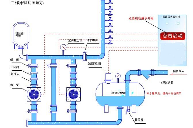 2.變頻泵的進水口與不鏽鋼穩流補償器相連,微機係統檢查穩流補償器內的壓力,當壓力降到零壓時,安裝在穩(wěn)流補償器內上方(fāng)外部的真(zhēn)空自動抑製器就(jiù)會自動打開穩流補償器內外空氣通道開通,通過進水壓力檢測和真空自動抑製器來保證穩流補償器內不產生負壓,從而保證自來水管網的正(zhèng)常供(gòng)水(shuǐ)。