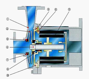 6、磁力泵運行500小時後(hòu),應拆檢軸承和端麵動環的磨損惰況,若軸承和軸(zhóu)套(tào)的間隙大於0.5~1mm,葉輪軸向竄動1.5~2mm時,應更換軸承和軸(zhóu)向(xiàng)動環。