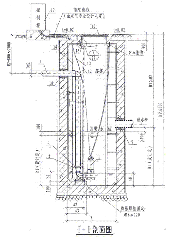 4.潛水排汙泵控製櫃安裝位置(zhì)由(yóu)單(dān)項工程設計考慮,其型號規格(gé)可由泵廠配套供應。池外電線電纜應穿管敷設。