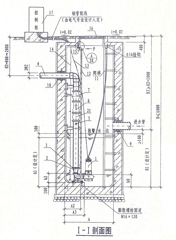 4.潛水排汙泵控製櫃安裝(zhuāng)位置由單項工程設計考慮,其型號(hào)規格可由泵廠配套供應。池外電線電纜應穿管敷設。