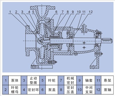 IH型泵是全國泵行業采用ISO國際標準聯合設計的係列產品,其(qí)主要由泵體、葉傳輸線、密封環、葉輪螺母、泵蓋、密封部件、中間支架、軸、懸架部件等組成。