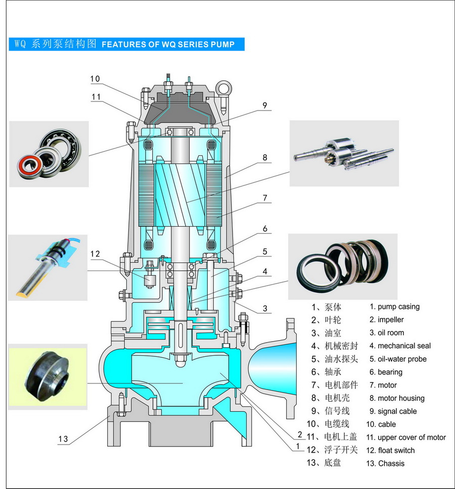 WQP型不鏽鋼排汙泵由電機與泵兩部分組成,二者通過油隔離室(shì)及(jí)機械密封(fēng)組件隔幵,屬機電一體(tǐ)化產品, 電(diàn)機與泵合用同一軸(轉子)整個水泵長度短,結構緊湊。配備(bèi)多種保護(hù)裝置,使得泵(bèng)運行安全可靠。其主要部件作用如下: