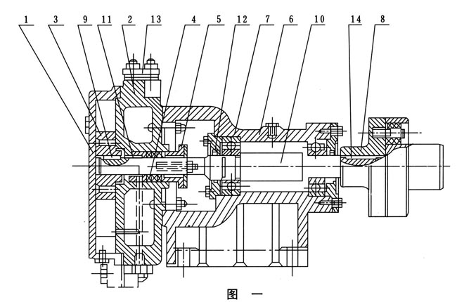 由(yóu)鑄鐵製成葉輪(3),有(yǒu)l2個葉片呈放射狀均分布,有平衡孔(kǒng)(其中兩個套扣供拆卸用)平軸向力(lì)。口十輪平鍵(9)與軸(10)聯接(jiē)並可沿(yán)軸向滑動調節間隙。軸(zhóu)為優(yōu)質鋼(gāng)製成,支承在泵的托架(6)內的兩(liǎng)個滾珠軸(zhóu)承(17)上右端有彈性(xìng)聯軸器(8)和電機直(zhí)接聯接。托架(6)用鑄鐵製(zhì)成,有止口保證與泵體(tǐ)準確(què)聯(lián)接,軸承間有空腔,可存潤滑油,用稀油或黃油滑均可。