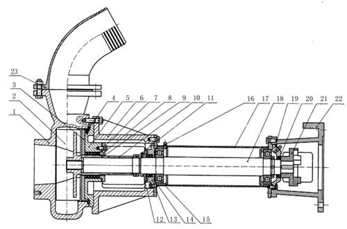 1、泵體 2、葉輪 3、泵(bèng)蓋護板4、泵(bèng)體膠墊 5、泵蓋 6、泵座7、油封 8、油封壓(yā)蓋(gài) 9、軸套 10、定位套(tào) 11、調整(zhěng)螺母 12、封塵端蓋 13、泵聯器 14、油(yóu)封 15、軸承(6313) 16、注油杯 17、中(zhōng)段 18、軸 19、上軸承壓蓋 20、油封 21、泵聯器 22、電機(jī)支架 23、出水彎管