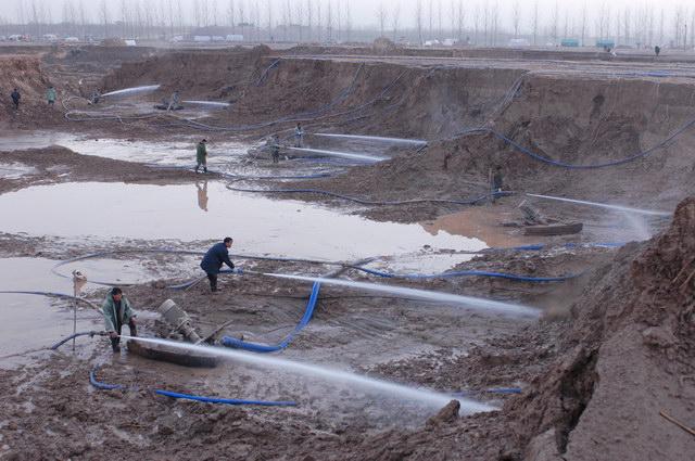 水利挖沙、挖(wā)土、衝填機組進行水利機械化施工,是模擬自然界水流衝刷得原理,借水力的作(zuò)用來進行挖沙、挖土工作,水經高壓(yā)泵產生壓力,通過水槍的噴射,射出高壓高速水柱,水(shuǐ)柱衝擊土沙,使土沙濕化、崩解、拌合成泥漿和泥塊的(de)混合物,再(zài)由立式泥漿泵提升,通過管道(dào)輸送到沙場。