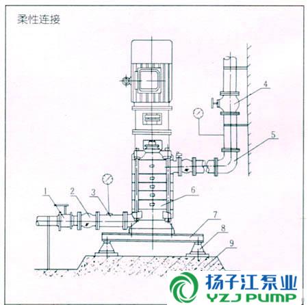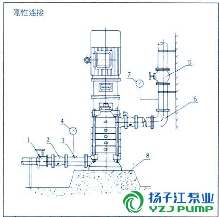 3. 泵與底座安裝有(yǒu)兩種方式,一種(zhǒng)是直接裝在水泥(ní)基礎上的剛性連接,另一種是采(cǎi)用JGD型減振器安裝的(de)柔性連接,具體方法見安裝示意圖(tú)所示.