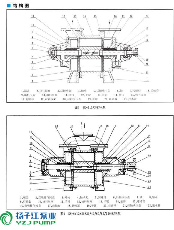 泵由泵體、兩個端蓋、葉輪、軸等部件組成。進氣和排氣竹通過安裝在端蓋上的園盤上的吸氣孔(kǒng)和樣氣孔與泵腔(qiāng)相連,軸偏心地安(ān)裝在(zài)泵體中,葉輪用平鍵固定在軸上。泵兩端而的總間隙山泵體和園盤之間的墊來(lái)調整,葉輪與端蓋(gài)上(shàng)的園盤之間的間隙由軸套(SK-1.5/3/6)或背帽(SK-12/20/30)推動(dòng)葉輪來調整,而(SK-42以上軸與葉輪為過盈(yíng)配合,此間隙由前端定位時確定.SK-42-60-85-120無軸套,其(qí)餘結構與SK-6/12/20/30相(xiàng)同。葉輪兩端麵與(yǔ)端蓋園盤的間隙決定氣(qì)體在泵腔內由進氣口至排氣口流(liú)動中損失的大小及其極限壓力(lì)。