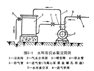 水環式真空泵引水裝置如圖5-1所(suǒ)示。水環式真空泵的(de)進(jìn)氣管6與水泵泵蓋的頂部相連,在沒有自來水的地方,必須配(pèi)置氣水分離器,作為真空泵冷卻水和補充水的水源。 圖中供水管4必須與進氣(qì)管(guǎn)6相接,在運行過程(chéng)中,氣(qì)水分離器的水在進氣管低壓的作用下,沿著管4不斷(duàn)向(xiàng)水環式真空泵內供水。 水環式真(zhēn)空泵真空引水的步驟:首先關閉水泵壓(yā)力水管中的閘明,向水環式真空泵內注水。注完(wán)水後,關閉漏鬥上的閥門,並打開進氣管上的閥門8及供水(shuǐ)管的閥門3,然後開動水(shuǐ)環(huán)式真空(kōng)泵。這時,排氣管中有(yǒu)水和氣的混合物排出.開始時,混合物中氣體占主要成(chéng)份,隨後,水的成份越來越多,直到全部為水時,說明水已(yǐ)全(quán)部充滿了水泵,於是引水(shuǐ)完成,可以起動水(shuǐ)泵了。再速即關閉進氣管上閥8,停止水環(huán)式真空泵運行。 如果泵站中有兩台以上的水泵,則可將水環式真空泵進氣管(guǎn)與抽(chōu)氣母管相通,每台泵的泵殼頂部通過抽氣支管與抽氣(qì)母管相連。在每個支管上都安裝一個閥門,以便可以單(dān)獨對每一台泵抽氣。有時,為了備用起(qǐ)見,可以設置(zhì)兩台水環式真空泵,每一台的進氣管上都安上閥門。當一台(tái)發生故障時(shí),可以(yǐ)關閉該泵上的進氣閥門,利用另外一台抽氣,不致耽誤水泵的(de)起動(dòng)。正常情況下兩台水環式真空泵可對水(shuǐ)泵(bèng)同時抽氣,以加快引水速(sù)度。整個管路布置如圖5-2所(suǒ)示。 |