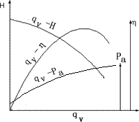 (2)離心泵的性能曲(qǔ)線 從前麵的討論(lùn)可以看出,對一(yī)台離心泵,在轉速固定 的情況下,其壓頭、軸(zhóu)功率和效率都與其流(liú)量有一一對應的關(guān)係(xì)。這些關係的圖形表示就稱為離(lí)心泵的性能曲線(xiàn),包括(kuò)qV-H曲線、qV-Pa曲線和qV-η曲線(xiàn),這些關係一般都通過實驗來測定。 離心泵的特性曲線一般由離心泵的生產廠家提供,標繪於泵(bèng)產品說明書(shū)中,其測定條(tiáo)件一般是20℃清水,轉速(sù)也固定。典型的離心泵性能曲線如圖所示。