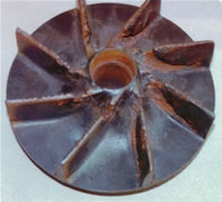 (1)汽(qì)蝕現象 對如右圖所示的入口管線,在0-0(位能基準麵)和K-K間列柏努利方程(chéng),得(dé): 在貯槽液麵上(shàng)方壓力p0一定的情況(kuàng)下,若增加泵的(de)安裝高度ZK(即(jí)Hg),則(zé)葉輪中心K處的壓力pK必然下降。當ZK增(zēng)加到使pK下降至被輸送(sòng)液體在操作溫度下的飽(bǎo)和蒸汽壓時,則被輸送流體在葉輪中心處(chù)發生汽化,產生大量汽泡;汽泡在由葉片中心(xīn)向周邊運動時,由於壓力增加(jiā)而急(jí)劇凝結,產生局部真空(kōng),周圍液體以(yǐ)很高的流速衝向真空區(qū)域;當汽泡的冷凝發(fā)生在葉片表麵(miàn)附(fù)近時,眾多液滴尤如細小的高頻水錘撞擊葉片。此種現象稱作“汽蝕現象”。 離(lí)心泵在汽蝕狀態下工作時,泵體振動(dòng)並發出噪音;壓頭(tóu)、 流量大幅下降,嚴重時不(bú)能輸送液體(tǐ);時間長久,在水錘衝擊和液(yè)體中(zhōng)微量溶解氧對金屬化學(xué)腐蝕的雙重作(zuò)用下,葉片(piàn)表麵出現斑痕和裂縫,甚至呈(chéng)海綿狀逐漸脫落(見右圖)。 通過以上討論可以看出,安裝高度過高(gāo)將會導致葉輪中心處的壓力(lì)過低,從而發生汽蝕。隻要泵的實際(jì)安裝高度低於允(yǔn)許安裝高度(dù),則操(cāo)作時就(jiù)可避免發生汽蝕現象。