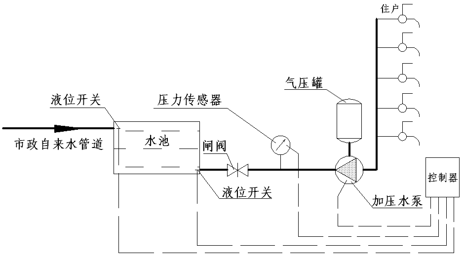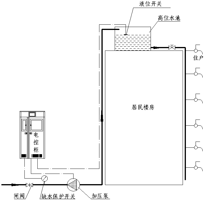 2、壓力/水位穩定(dìng)。係統配(pèi)置的小型氣壓罐/液位開關能保證用水高峰期管道壓力(lì)穩定和水(shuǐ)池水位。