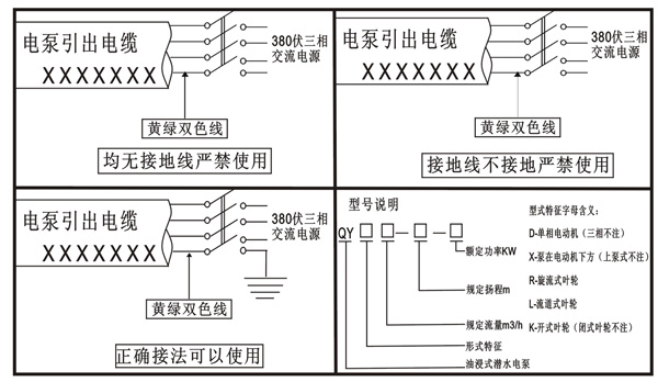 1.引出電纜中一根帶有接地標誌的黃綠雙色芯必須接地線。如無固定地線,可用2米金屬棒埋入河湖岸邊,水溝邊或潮濕的土中作地線。