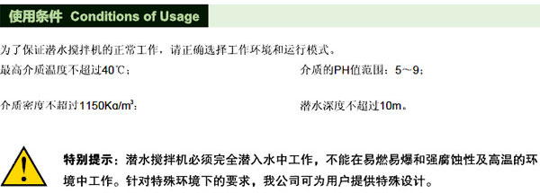 潛水攪拌機必(bì)須完全潛入(rù)水中工作,不能在易燃易爆和強腐蝕性及高溫的環境中工作。針對特殊環境下的要求,我公司可為用戶提供特殊設計。