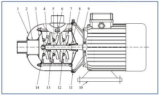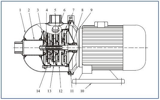 (1) 泵為臥式、多級節(jiē)段式結構,軸水平方向為進水口,徑向為出水口。