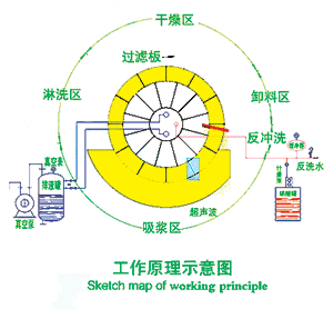 工(gōng)作原理: 吸漿區:工作時浸沒在料(liào)漿的過濾板在毛細作用下結合真(zhēn)空壓力,表麵吸附(fù)成一層濾餅,濾液通過(guò)濾板進分配閥至排(pái)液(yè)罐。 淋洗區:濾餅轉出料漿鬥後,對濾餅進(jìn)行噴淋洗滌。 幹燥區(qū):濾餅繼續在水環真空泵高真空力的作用下脫(tuō)水。 卸料區:進入無(wú)真(zhēn)空的情況下,刮刀自(zì)動卸料。 反衝洗:工業水或濾液通(tōng)過分配閥進入陶瓷板(bǎn)由內向外進行清洗。清(qīng)洗堵塞的微孔。在陶瓷板使用一個(gè)周期後,采用超聲波配合低濃度酸混合清洗,保持陶瓷板的高效使用。 |