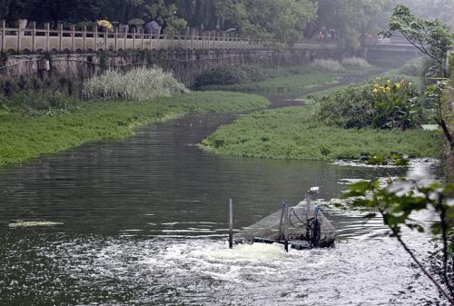溫州市區九(jiǔ)山外河中,一台潛水離(lí)心式曝氣機正在工作,產生湧泉般的水流像“趵突泉”,給河麵增添了幾分生(shēng)氣。 這種造流曝氣機(jī)工作時能給(gěi)河水充氧,提(tí)高水體溶解氧的(de)濃度,增(zēng)強水(shuǐ)體的自淨能力(lì),以改善水質。在長約1公裏的九(jiǔ)山外河,共有20套造流曝氣機,每(měi)天工作8小時。此外,外河道裏還種(zhǒng)植了旱傘草、美人(rén)蕉等挺水植物,以及睡蓮等浮水植物,共同組成河道的(de)生態修複工程。