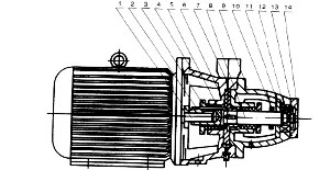 泵體4與電機法蘭連接,泵軸8裝在(zài)電機軸頭上是動(dòng)配合,鍵(jiàn)2在鍵(jiàn)槽內可自由滑動。