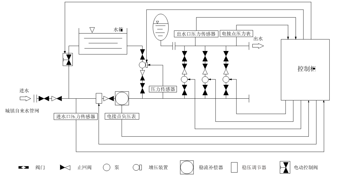 設備能在用水高峰時自動切換到水箱吸水(shuǐ)若幹小時,以保證水箱的水一天的(de)循環。