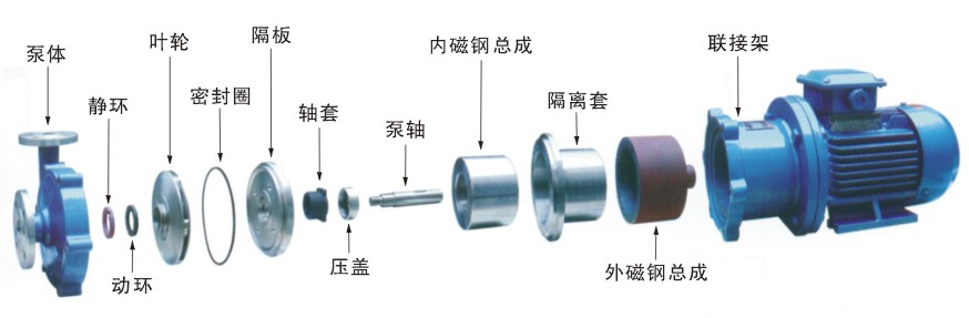 磁力(lì)泵主要構件是泵(bèng)體、葉輪、內磁鋼、外磁鋼、隔離套、泵內軸、泵外軸以及滑動軸承、滾動軸承、聯軸器等組成。