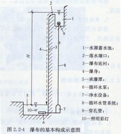 人工瀑(bào)布的基(jī)本構成是由瀑布的水源(yuán)蓄水池(chí)、落水堰口、瀑布底襯、瀑身、承瀑(bào)潭或(huò)稱循環水池、循環泵、淨水設備(bèi)、循(xún)環管(guǎn)道係統及照明彩燈等組成,見圖(tú)2. 2-4。