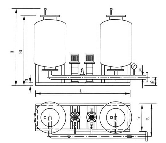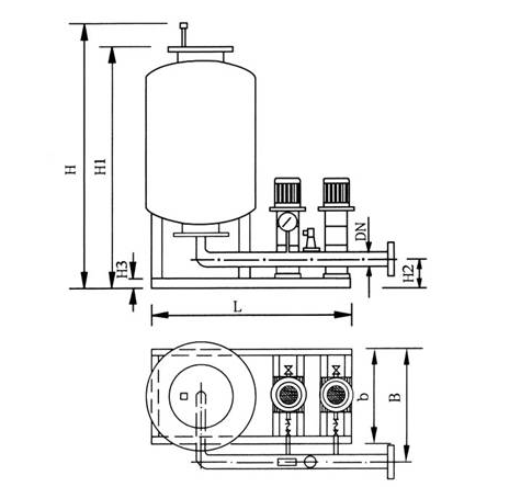 氣室按工藝設計充入預壓(yā)所需的氮氣,裝置連接(jiē)係統,安裝完畢,打開本裝置與(yǔ)係統之間的閥門。當係統水溫的變(biàn)化(huà)引起水(shuǐ)的容積膨脹或者(zhě)收縮時,由隔膜罐自行予以(yǐ)吸入或吐出,使係統壓力穩(wěn)定在予先設定(dìng)的壓力上下限的區域裏。如果係統由於漏水(shuǐ)或其它原因引起壓力下降至予設(shè)壓力的下限時,由電接(jiē)點壓力繼電器動作(zuò)啟動穩(wěn)壓泵(bèng),使之向係統供水(shuǐ),直至壓力達到所(suǒ)設定的壓力(lì)上限值時止。若(ruò)係(xì)統壓力超過設定的高壓力值時,安全閥自行向軟水箱或(huò)地溝泄水降壓,如此反複,以維持係統的壓力平衡(héng)。
