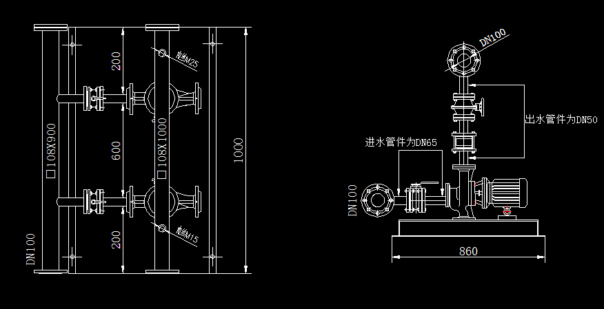 一用(yòng)一備恒壓消防供水(shuǐ)成套設備配(pèi)臥式消(xiāo)防泵尺寸(cùn)圖: