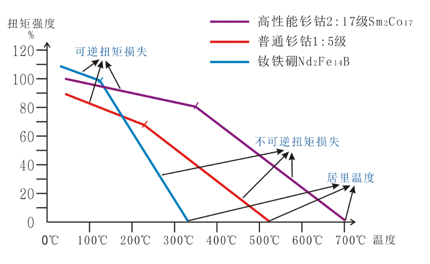 當溫度超過350℃,高(gāo)性能釤鈷材質的磁鋼將會進入不可逆扭轉損失。