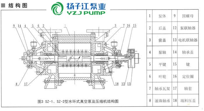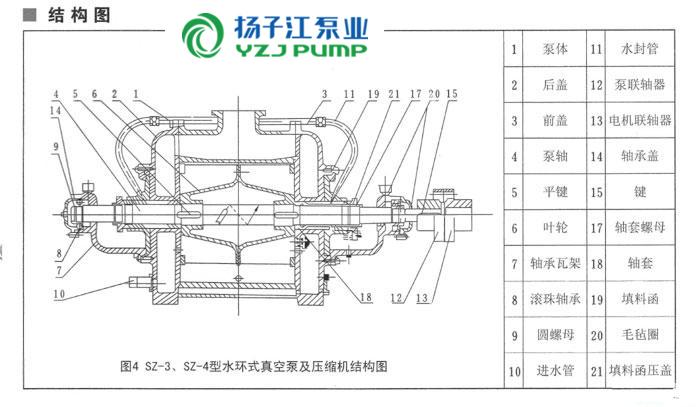 SZ-1及SZ-2的結構如(圖3)所(suǒ)示,其與SZ-3及SZ-4結構(圖4)不同之處是:進、排氣管分別在兩個側蓋上,一根管與進氣口相通,一(yī)根管與排氣(qì)口相通,泵內(nèi)無橡皮閥。