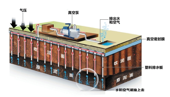 在一(yī)片泥漿裏,記者看到一塊像水稻田一(yī)般的(de)泥地,上麵已經被鋪上了一(yī)層密(mì)封膜(mó),密封膜由真空膜、無(wú)紡布、濾管網、編織(zhī)布組成,排水板被密密麻麻插進泥裏,一直深入原泥層,邊上是一台真空(kōng)泵,將(jiāng)軟泥裏的空氣和水通過排水管排(pái)出(chū)地麵,再(zài)利用大(dà)氣(qì)壓強把泥(ní)麵壓結實。“這是10畝試驗區(qū),試驗成功(gōng)後(hòu),再到A1區3800畝試驗,一塊一塊壓。”張雄壯說,這個過(guò)程很慢,要慢慢壓,把裏麵的水和空氣都(dōu)排(pái)出來,需要90天左右(yòu),因為泥麵會慢慢下沉,因此一般軟基處理前(qián),泥麵會高出地麵1.2米左右。密封很重要,因此看起來不起眼的膜都是特製(zhì)的,要(yào)特別堅韌、防老化,而且一塊就(jiù)有1.5萬平方米(mǐ)。