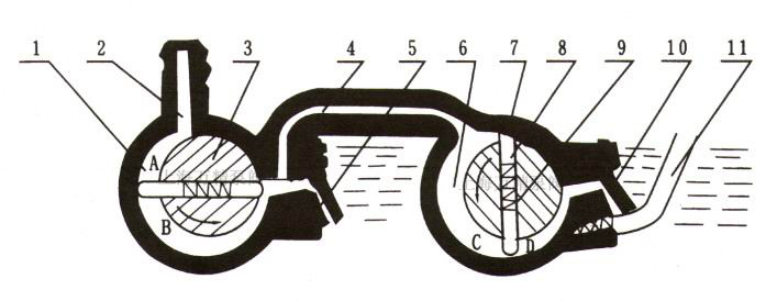 5、圖(tú)1是旋片(piàn)式真空泵泵原理圖,轉子3及7與高真空室(shì)外1及低真空室6相切,轉(zhuǎn)子3及(jí)7沿箭頭方向旋轉,帶動轉子槽內滑動的轉片旋轉,由於彈簧9及離心力的作用, 轉片外端緊貼高低真空室的內表麵滑動,把轉(zhuǎn)子與高低真空室所形成的(de)月窪形空間從(cóng)進氣嘴2到排氣閥門5和從過氣管4到排氣閥門10之間分隔開來,形成二或三個容積,並且周(zhōu)期(qī)性的大小變化,當在圖示旋片式真空泵位(wèi)置繼續旋轉時A及C容(róng)積逐漸(jiàn)增大,被抽容積氣體沒進氣嘴進入泵(bèng)內,同時B及D容積逐漸減少,壓力升高,隨(suí)後衝開排氣閥門5及10,將氣體排出真空室外,氣體經過油麵(miàn)而排於大氣之(zhī)中,因為油是淹住排氣門(mén)的,故能防止氣體返(fǎn)回(huí)真空室。當抽氣壓強較高時,高低真空室的閥門都排(pái)氣,相(xiàng)當於單級泵,當真空度較高時,全部氣體進入真空室,再由排氣閥門10排出,此時二(èr)級串聯即進入雙級泵工作。