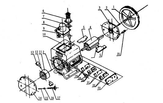 2、裝配(pèi)前應清洗幹淨並烘幹,按(àn)圖4進行裝配(pèi),先裝高(gāo)真空端,將彈簧轉片托起裝入高轉子(zǐ)內,然後放進(jìn)高真空室,裝上前端板,再裝定位銷釘,均勻擰緊螺釘(dìng),裝配後應保證轉(zhuǎn)動靈活(huó)輕鬆 ,均勻一致。然後再裝低真空轉子及(jí)後端蓋,低轉片的槽應向後端(duān)板一邊。再裝排氣門,排氣閥(fá)片應貼緊閥板坐,再裝其它零件。