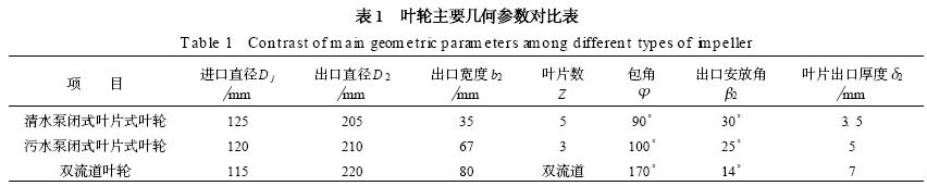 通過對一(yī)個實例的(de)設計來進行分析、比較, 其設計參數為: 流量Q = 145m 3/h , 揚程H = 10m , 轉速(sù)n =1 450 r/m in, 電機功率P 電機= 7. 5 kW , 要(yào)求通過固(gù)體顆粒的大直徑為45 mm。為了便於說明(míng)問題, 對於閉式葉片式葉(yè)輪分別(bié)給出了按普(pǔ)通清(qīng)水泵及(jí)汙水泵的設計結果。所有的水力設計均采用(yòng)速度(dù)係數法進行, 其中閉式葉片式葉輪的設計方法參見文獻, 雙流道(dào)葉輪的設計方法參見文獻。表1 列出(chū)了上述葉輪主要幾何參數的對比(bǐ)情況。
