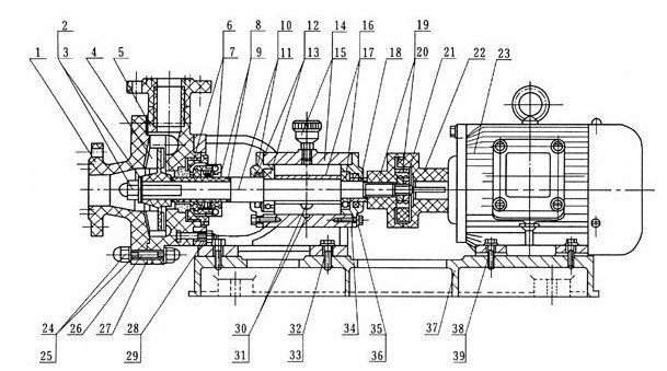 6、如果更換滾珠軸(zhóu)承或泵軸時,必須折下機架,鬆開(kāi)前端軸承蓋(gài)4隻螺釘,折下(xià)泵軸後端園螺(luó)母和聯軸節,將泵軸向前(qián)端方向打出即可,再後折下後(hòu)端軸(zhóu)封蓋(gài)。