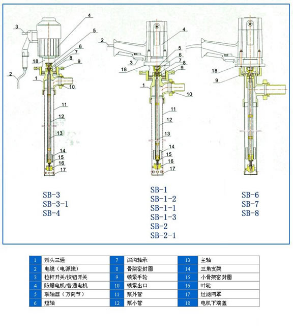 香蕉视频网站江SB係列(liè)插桶泵(油桶泵,電動抽液泵)可以直接插入物料桶(大適用於符(fú)合GB/325-1991標準的鋼桶)中抽取桶中液體。可輸送(sòng)各種油料、帶腐蝕性化學(xué)藥水、其他液體。根據所輸送的液體性質,泵體沾濕部(bù)分材料可選用(yòng)鋁合金、不鏽鋼,316不鏽鋼等組成。驅(qū)動電機配備單相(xiàng)標準電機,防爆電(diàn)機,高轉速(sù)電機等多種選擇。根據(jù)材質,電機不同,型號可分為: SB-1,SB-2,SB-3,SB-3-1,SB-4,SB-5,SB-6,SB-7,SB-8係(xì)列鋁合金,不鏽(xiù)鋼或防爆型。我們備有詳細資料,歡迎索取(qǔ)。香蕉视频网站江該係列(liè)泵可按防爆(bào)區域和非防爆區域選用,凡在防爆區域使用配置防爆型電(diàn)機,這類電機分三種機組型號,當使用條件含各種易燃易爆混合時,應選(xuǎn)用高組級。