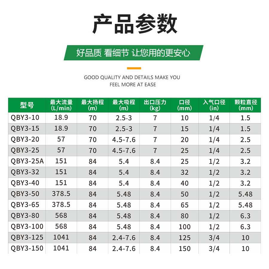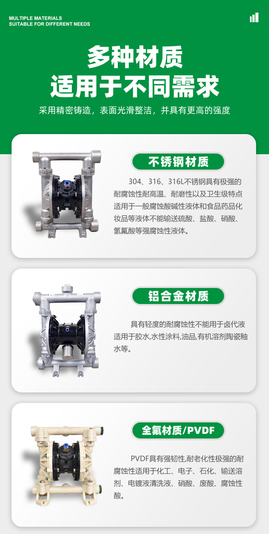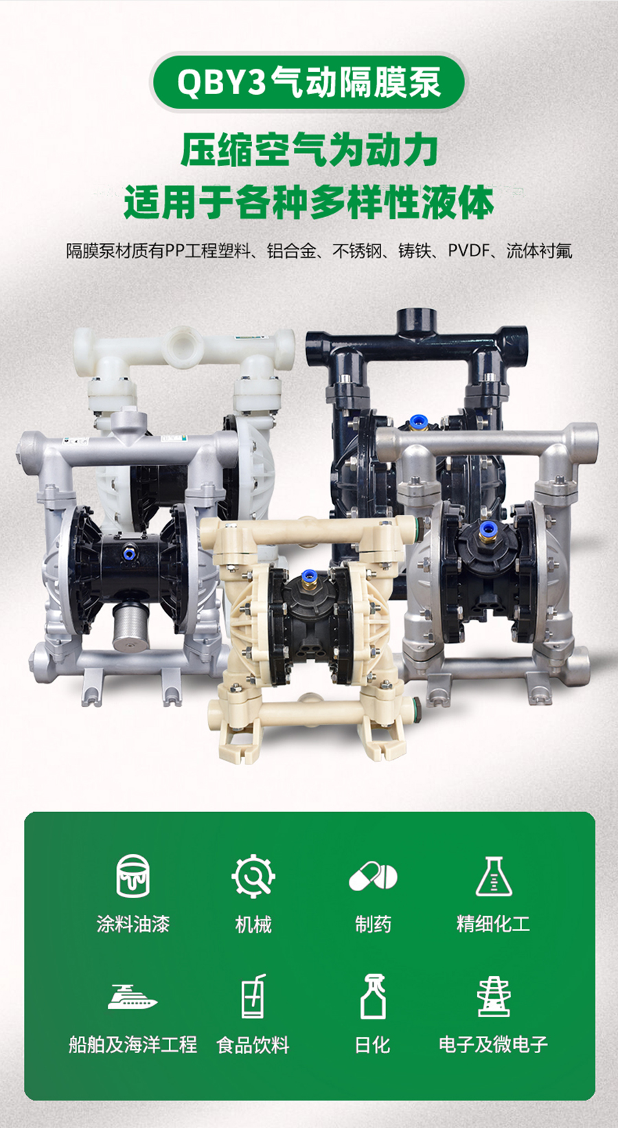 QBY係列(liè)氣動隔膜泵是一種新型輸送機(jī)械,是目前國內新穎的一種泵類。采用空氣壓縮機壓縮空氣為動力源,對(duì)於各種腐蝕性液體,帶顆(kē)粒的液體,高粘度、易揮發、易燃、劇毒(dú)的液體,均能予以抽光(guāng)吸盡(jìn)。其性能參數與聯邦德國的 WLLDENPVMPS、美國的MARIOWPUMPS相近.本廠目前已形成係列化生產