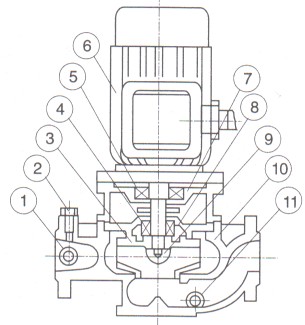 1、取壓閥 2、排氣閥 3、葉輪 4、機械密封 5、軸承 6、電機 7、聯體座(zuò) 8、泵蓋 9、葉輪螺母(mǔ) 10、泵體 11、放水閥