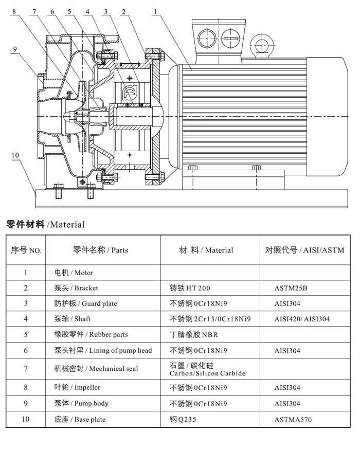 ZS型不(bú)鏽鋼臥式單級離心泵為泵軸直聯型聯結,由泵、泵軸和(hé)標準(zhǔn)電機組成: