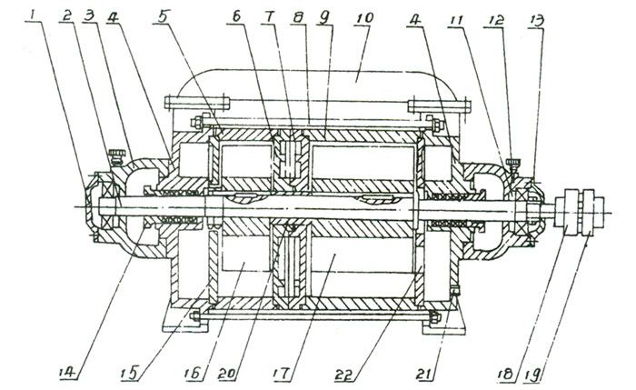 1、後(hòu)軸承壓蓋 2、軸 3、軸承架 4、前後端蓋 5、短泵體 6、中間壁(B) 7、中間壁(A) 8、拉緊(jǐn)螺栓 9、長泵體 10、連(lián)通(tōng)管(guǎn) 11、調整墊(diàn) 12、油杯 13、前軸承壓(yā)蓋 14、填料(liào)壓蓋 15、後蓋園(yuán)盤(pán) 16、短葉輪 17、長葉輪 18、泵聯軸器 19、電機聯(lián)軸器 20、軸套 21、進水孔 22、前蓋園盤