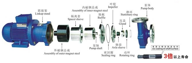 磁力泵以靜密封取代動密封,使泵的過流部件 處於完全密封狀態,徹底解決了其(qí)它泵的機械密封無法避免的跑、冒、滴之弊病。磁力泵選用耐腐蝕、高強度的 工(gōng)程塑料、鋼玉陶瓷、不鏽鋼作為製造(zào)材料,因此它具(jù)有(yǒu)良好的(de)抗腐蝕性能,並可以使被輸送介質免受汙染。