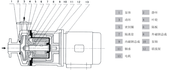 CQ型工程塑料磁力驅動泵(簡稱磁力泵),是應用現代磁學原理,將永磁聯軸器的工作原理(lǐ)用於離心泵的新型產品,磁力泵以靜密(mì)封取(qǔ)代動密封,使泵的過流部(bù)件處於完(wán)全密封狀(zhuàng)態,徹底解決了其它泵的機(jī)械密封(fēng)無法(fǎ)避免的跑、冒(mào)、滴之弊病。磁力泵選用耐腐蝕、高強(qiáng)度的工程塑料、鋼玉陶瓷(cí)、不鏽鋼作為製造材料,因(yīn)此它具有良好的抗腐蝕性(xìng)能,並可以使被輸送介質免受(shòu)汙染(rǎn)。