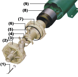 部(bù) 件 1、固定螺絲及墊圈 2、泵殼 3、泵軸 4、葉輪 5、被動磁(cí)鐵 6、密封圈 7、隔離套 8、主動磁鐵 9、電機 |